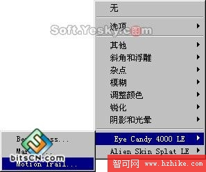 使用濾鏡:在Fireworks中支持使用特效插件,也就是支持第三方濾鏡。例如,在特效選項菜單中的Eye Candy 4000 Le項就是AlIEn Skin公司所提供的濾鏡,如圖4—05。