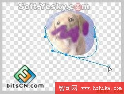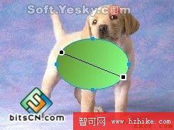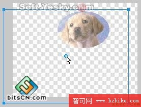 然後同時選中選中兩個對象(按Ctrl+A鍵),使用菜單欄上的“修改—蒙版—組合為蒙版”命令,兩個對象就被組合為蒙版圖形了。用鼠標拖動蒙版圖形的藍色中心點即可移動下層的被蒙版對象(小狗圖),效果如圖4—18。