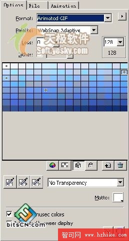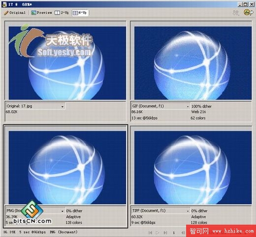 只有通過比較鑒別才能突出不同圖像格式的色彩和大小等特點,為此,我們首先講一講如何在導出時對不同格式進行選擇。Fireworks裡提供了在線比較不同的優化方式和原圖的效果的窗口,2-up模式和4-up模式。若比較一幅圖像的GIF導出效果與原圖的差別,可以使用2-up模式和4-up模式。若比較一幅GIF導出效果與原圖的差別,可以使用2-up模式。若希望比較兩三種格式或優化方式的優劣時,就可選擇4-up模式。圖1顯示了原圖與GIF、PNG和TIFF三種格式的導出圖像的差異,同時窗口中還顯示了每一種優化方式或格式的主要參數、圖像大小和傳輸時間等信息,可以幫助用戶在不同圖像格式之間的選擇。