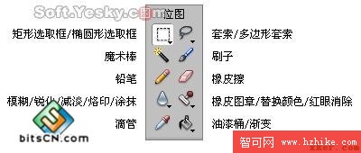 圖2—01為工具條中位圖區的主要工具,其中的“矩形”、“橢圓形”、“套索”、“多邊形套索”和“魔術棒”工具都用於約束位圖的編輯范圍,所有的位圖編輯例如剪切、復制、填充等只能在該范圍內有效。