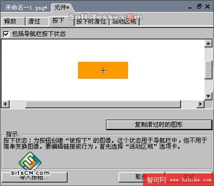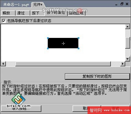 “按下時滑過”選項是設置按鈕在被按過之後鼠標再次滑到按鈕上時,按鈕所呈現的形狀。該項同樣是在選中“包括導航欄按下狀態”後才能生效。我們點擊“復制按下時的圖形”後,把上一幀的按鈕色彩改為黑色,以便區別。