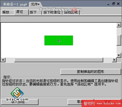 “滑過”選項卡是繪制當鼠標移動到按鈕上及按下時,按鈕所呈現的狀態。在這裡我們可點擊“復制彈起時的圖形”按鈕,將“釋放”選項卡中的按鈕圖形復制過來,然後只更改其色彩,以便區分。如圖8—05。或者你也可以在此繪制你想要的其它圖形。