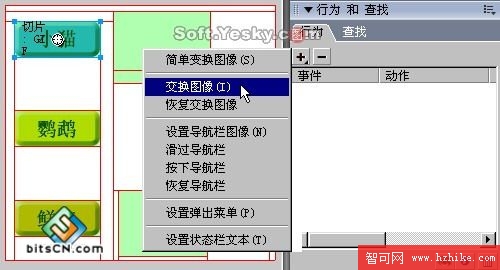 接著,點選“小貓”的按鈕切片後使用“行為”面板上的“交換圖像”指令,如圖9—12,從而啟動“交換圖像”的詳細設置對話框(圖9—15)。