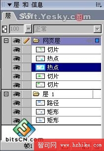 網頁層:所有的“切片”和“熱點”區域都被保存在“層”面板中的“網頁層”內,以劃分它們與圖像層的區別。但同時也可以像對待圖像層那樣對網頁層進行例如重命名、選擇、刪除、展開/折疊層、隱藏/顯示層、鎖定/編輯層等操作,如圖10—01。