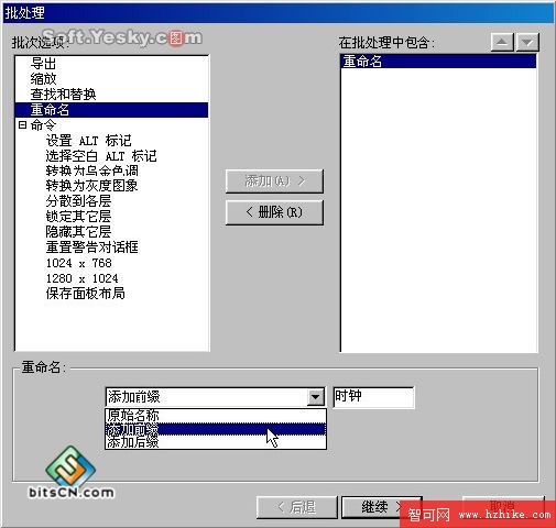 ,還可以設置執行動作時的先後順序。對於不需要的動作指令也可以從列表中選中後點擊“刪除”按鈕。在這裡我們試著把剛才導入的兩張圖片的原有名稱面前加上“時鐘”兩字,然後點擊“繼續”按鈕,進入下一個設置步驟。