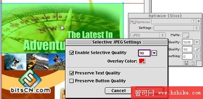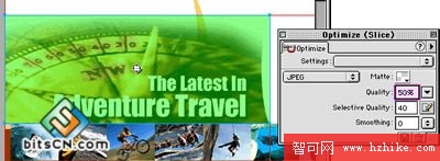 ·在這段中,我們將在網頁中切割圖片進行優化。在上面有文字的羅盤圖象需要進行選擇性的JPEG優化。文本區域應該用於其它部分不同的設置保存