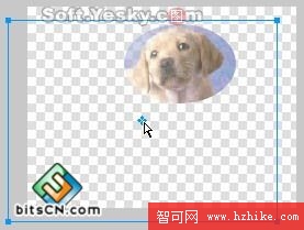 然後同時選中選中兩個對象(按Ctrl+A鍵),使用菜單欄上的“修改—蒙版—組合為蒙版”命令,兩個對象就被組合為蒙版圖形了。用鼠標拖動蒙版圖形的藍色中心點即可移動下層的被蒙版對象(小狗圖),效果如圖4—18。