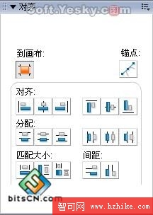 此外,通過組合面板中的“對齊面板”,也可以對選擇的對象進行各種對齊方式,其中的“到畫布”是指對象以畫布邊緣為對齊坐標。而“錨點”則可以對路徑節點設置各種不同的對齊方式。