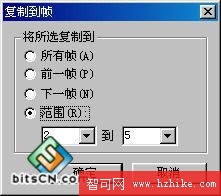 復制到幀:單擊該項,如圖6—09。可把某幀在畫布上的對象復制到其它的幀上。也可以在對話框中輸入復制幀的“范圍”。
