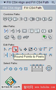 我們不能用Stroke去給矩形加外邊框,因為虛邊會把你給搞死。如果你用Rounded Rectangle工具畫出來的圓角矩形已經出現了非Stroke虛邊,那就把節點打散後,用黑色箭頭工具選中那個Path,點擊路徑面板的Round Points to Pixels把路徑的所有節點歸位到像素交點(也可以用白色箭頭工具選中某個節點單獨進行歸位)。