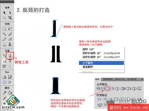 接著,我們開始制作瓶頸,用鋼筆工具勾畫出半個瓶頸的形狀,通過復制-水平翻轉,得到右邊半個,這樣制作的瓶頸看起來對稱平整,比完整勾勒的更好。用路徑面板中的組合路徑拼合他們。