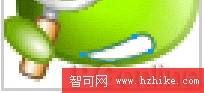 對該外形使用全白色的實習填充,描邊色為# 4b7702的1像素柔化。為了使嘴部也能呈現一定的立體感,我們也要為它建立一個投影對象。先將這個路徑再復制一個出來,然後對復制對象改用# 4d7902的實心填充,羽化值為3,並取消掉原來的描邊色。然後將這個復制對象通過“層”面板的位置調整,移到綠豆“小嘴”對象的下方。然後用方向鍵將投影對象向上和向右分別平移3像素和1像素的距離。不過這樣還沒算完,再用“部分選擇”工具將這一投影對象左側的路徑節點選中,並將其向下移動3個像素,如圖15。