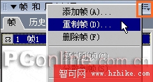 為了使這個靜態表情能夠動起來,我們要先建一個畫布大小為65*65大小的新文檔,然後將組成“放大鏡”表情的所有對象選中並復制到這個新畫布上來。接著再啟動“幀”面板。在面板的右上方點擊其下拉菜單,從中選擇“重制幀”項,也就是復制幀的意思。如圖16。