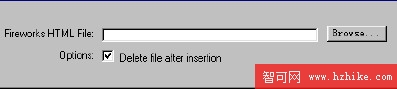 2)單擊"insert fireworks html"按鈕或者使用菜單命令"insert"-"interactive image"-"Fireworks html".在彈出的的對話框裡單擊"browse",選擇需要插入的firework Html文件,如圖