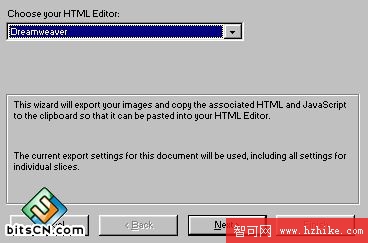 2)這時會顯示"copy html code"向導窗口,並自動將該圖片及包含的所有Html,Javascript信息拷貝到剪貼板中,首先你需要確定使用的Html編輯器,默認為dreamweaver.如圖