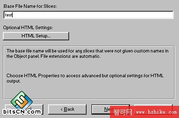 3)單擊"next",在隨後的窗口中鍵入切片的基礎文件名,這個名字會應用到圖片每個切片中,另外你可以單擊"Html setup"按鈕進行更高級的設置.如圖