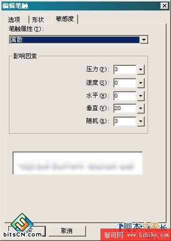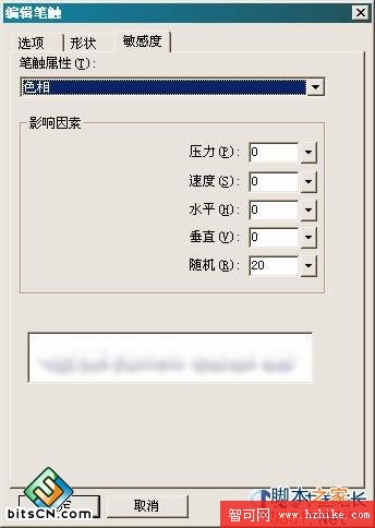 5、[編輯筆觸] – [敏感度]選項卡中只要設置[離散]和[色相]就可以 了,其他數值都為”0”。 [離散]和[色相]的具體數值請按下圖設置 。