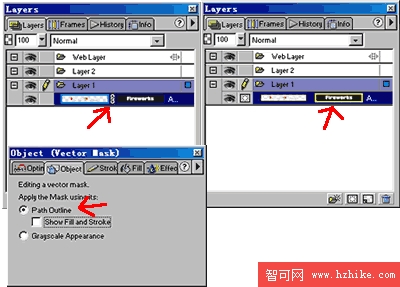 9、選中動畫,然後在Layers面板裡點擊圖中箭頭所示,把遮照之間的關系取消;然後選取字體,選取字體後Object面板會出現兩個選項,選path Outline(箭頭所指),選好後在Layers面板裡恢復遮照之間的關系。