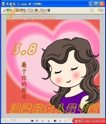 14、在這個新的畫面上,我們可以對原先的圖畫做一些改動,例如將心形的內外層顏色對換,將數字3。8以及文字“屬於你的節日”都更換一種不同你的顏色,將原先的“有愛的女人最美麗”的標語,改成“溫柔的女人最可愛”,為了表現的更加生動,我們還可以在美麗女人的腮上增加兩朵紅暈,為了使紅暈更加自然,可以通過對圓形進行羽化來實現,經過以上的這些修改,我們就會發現一幅不同於上一幅的新畫面,如圖14所示。