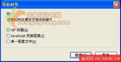 16、點擊畫面下邊狀態欄中的播放按鈕,就可以對動畫效果進行預覽,滿意以後就可以將圖片導出了,由於文件中包含動畫,我們不能簡單的保存,單擊文件,選擇導出向導,會出現關於處理幀的對話框,在這裡我們選擇GIF動畫,如圖16所示。