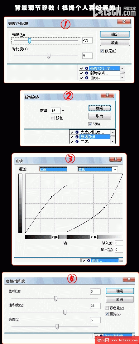 2、新建500*350畫布,插入背景圖片。然後調整亮度和色調如下。