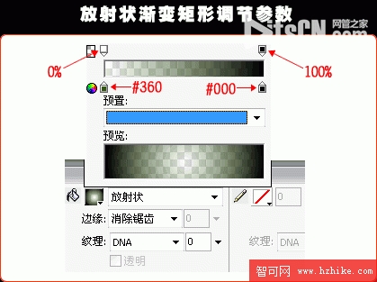 3、拉一個大小為500*350的放射狀漸變的矩形。參數設置如下。