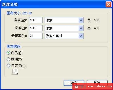 2、在彈出的【新建文檔】對話框中設置畫布的寬度和高度為400像素,背景顏色為白色。如圖1.2所示。