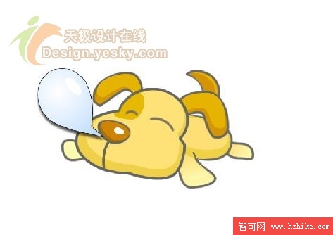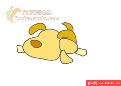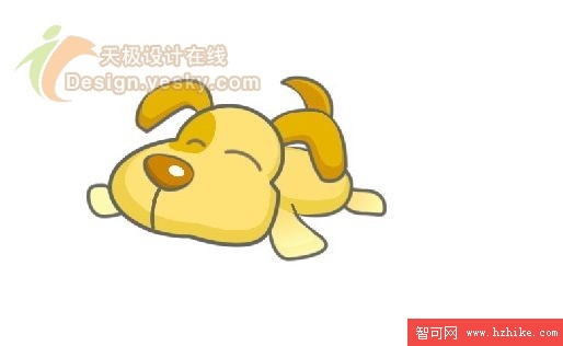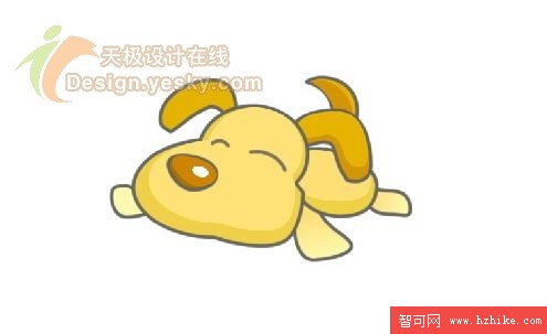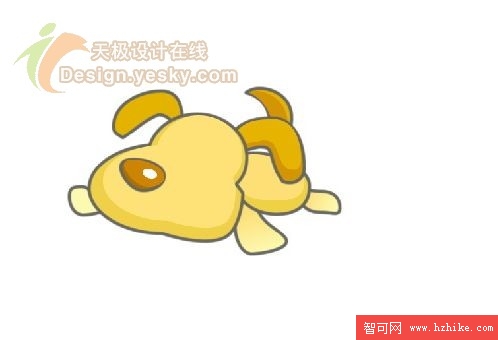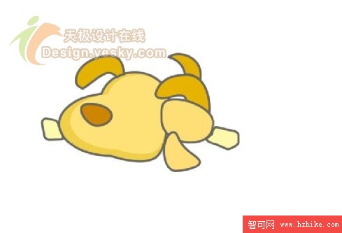 6. 輪廓勾勒出來之後下一步的工作就是填充了。對於狗狗的不同部位我們就要填充上各種不同的顏色了。如圖6所示。其中,鼻子、耳朵和尾巴等部位的顏色要填充深一些,而身體等部位的顏色可以稍微淺一些。這裡鼻子的填充顏色為#CE8500,耳朵和尾巴的填充顏色為#E6B300,身體的填充顏色為#FEE277,腳的顏色為#FEF8AA。design.yesky.com©天極軟件頻道設計在線版權所有©2001324542