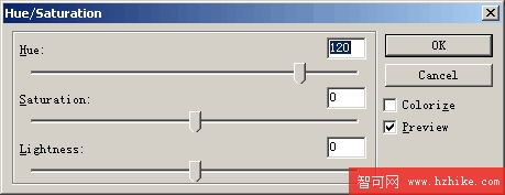 2.將圖片克隆(原地復制,當然用復制、粘貼也可)幾個,這主要取決於你希望所變顏色的多少。例中有三種顏色變化,故克隆三個,可以理解為 Flash裡的關鍵幀,選中克隆的圖片,選擇菜單項濾鏡(Filters)->顏色(adjust color)->調節色相對比度(hue/saturation),對關鍵圖片進行變色處理,需要注意的是,在調節過程中,不要調節亮度,否則整個圖片都發生了變化,首先調節為綠色!色相值:120,如圖所示是綠色圖片的參數設置。