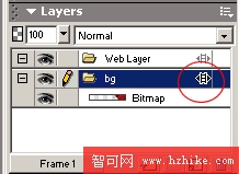 5.好了,前期工作基本就緒,開始真正的動畫了,現在看看你的幾個主要面板都打開了嗎?庫面板 (Window->Library F11)、幀面板(Window->frames Shift+F2)、層面板(Window->layers F2)。如果沒有打開,按括號中的打開吧。首先點擊層面板,雙擊我們的背景所在層,在彈出的小窗口裡的方框裡打上勾,(在輸入欄裡可以給圖層起個好記的名字,看你的愛好了~!),即共享這個圖層,也就是說,在以後的動畫中,這一層是始終不變的。完成後圖層右面出現個膠片的圖標,對,就是那個小梯子,呵呵,如圖