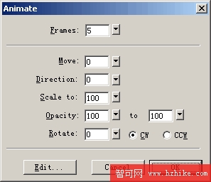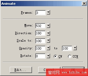 13.選中第12幀,輸入文字“Fireworks愛好者的家園”,復制一下,隔一幀,也就是在14幀粘貼,然後在16幀也粘貼,並將該幀幀速改為100。這樣文字就有閃爍的效果了~!選擇第17幀,將文字復制一個,選中,再用Motion Trail...濾鏡,給文字加上運動的尾巴,角度為0,相信大家已經理解了吧。然後按F8將其轉化為動畫符號,設置為3幀,運動方向為180度,設置如下圖。(幀數少了,文字飛出的速度就越快。還有,運動的長度可以根據需要自己調整,無須拘泥與教程。)