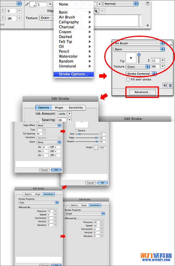 4,隨後在描邊色邊上的下拉框中選擇“筆觸選項”,設置參考如下英文設置,這裡這麼做的目的是將之前鋼筆輪廓進行描邊
