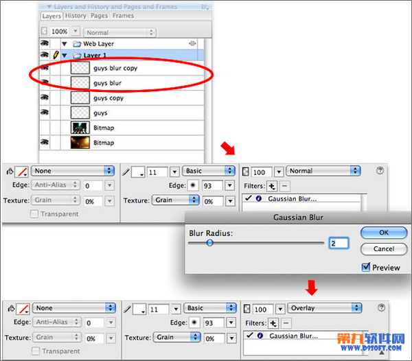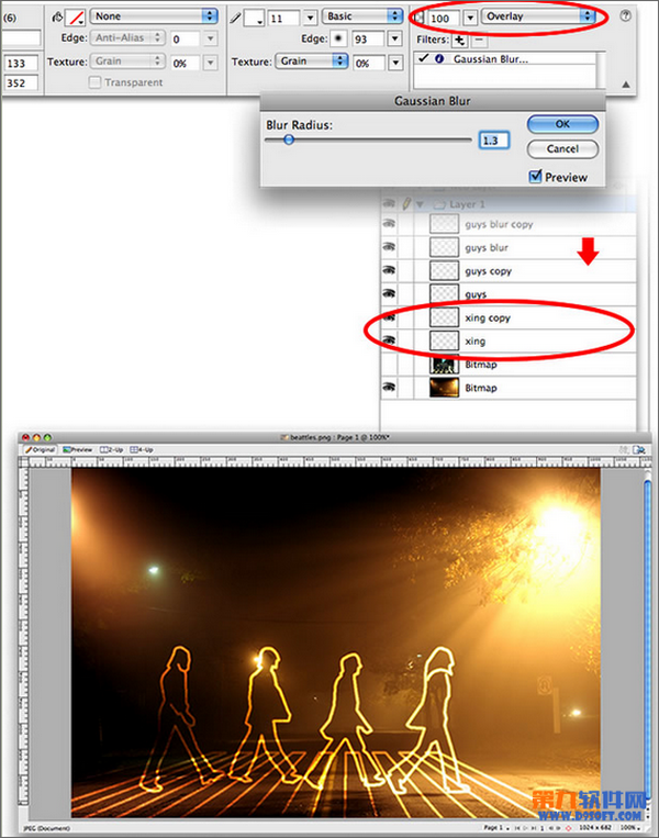 5,復制我們之前做好的人物剪影輪廓描邊3次,隨後為最上面的輪廓圖層(guys blur copy)使用高斯模糊,設置模糊范圍為2,然後將四個圖層同時選中,使用混合模式中的“正片疊底”,這樣之前的白色輪廓就會以金色背景為底色,制作出很特殊的漸變效果
