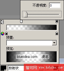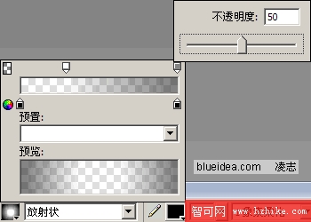 9、設定層2中的圓形為放射狀填充:左右兩側顏色均為黑色,將上方的不透明度選項做調整,將其中左側的不透明度選項稍向右移動,並將其值設置為0。