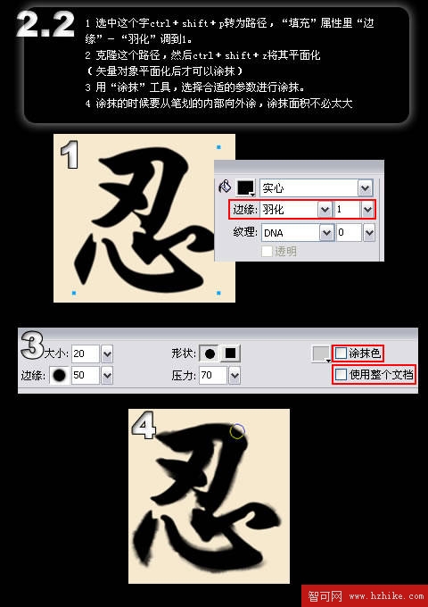 塗抹的時候要從筆劃的內部向外塗,塗抹面積不必太大