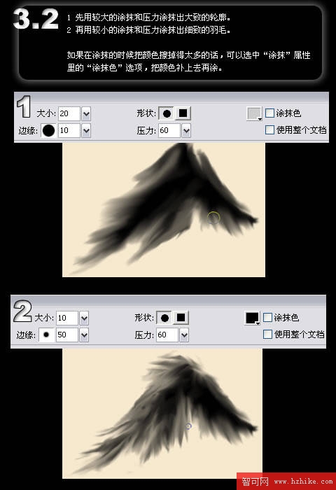 再用較小的塗抹和壓力塗抹出細致的羽毛。