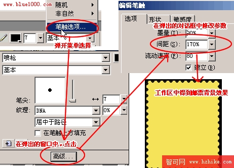 3、在畫一個矩形,大小為144*174,位置為261*143,填充顏色選擇黃色(色彩代碼:#F5E459)。邊線顏色為黑色,選擇邊線的樣式“噴槍”—>“基本”,點開“基本”菜單,選擇“筆觸選項”打開菜單,點擊“高級”按鈕,彈出“編輯筆觸”對話框,在“選項”下修改“間距”為170%,最後在工作界面我們看到郵票背景效果,如圖二。