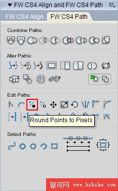 我們不能用Stroke去給矩形加外邊框,因為虛邊會把你給搞死。如果你用Rounded Rectangle工具畫出來的圓角矩形已經出現了非Stroke虛邊,那就把節點打散後,用黑色箭頭工具選中那個Path,點擊路徑面板的Round Points to Pixels把路徑的所有節點歸位到像素交點(也可以用白色箭頭工具選中某個節點單獨進行歸位)。