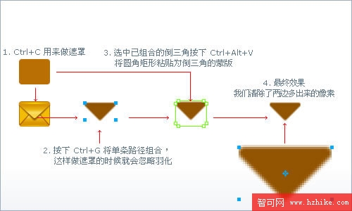 把大的圓角矩形復制一份放到最頂層,用白色箭頭配合Shift+方向鍵得到一個倒三角,隨即復制一份,上面的倒三角用Linear填充漸變;下面的倒三角實心填充褐色,並設置1px羽化。
