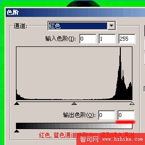 上圖中選擇使用綠色通道(此圖該通道對比度較高),因此將紅色、藍色通道的輸出色階最高值設置為0。