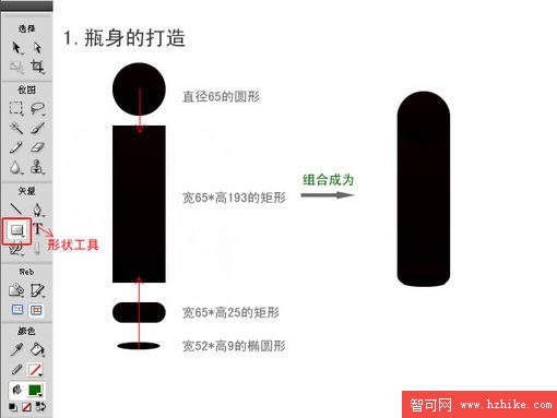 首先,用形狀工具畫出相應的形狀,通過這些形狀的組合,我們能夠得到一個瓶身。