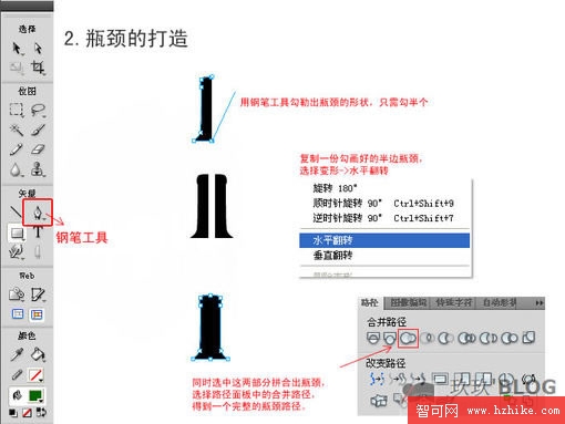 接著,我們開始制作瓶頸,用鋼筆工具勾畫出半個瓶頸的形狀,通過復制-水平翻轉,得到右邊半個,這樣制作的瓶頸看起來對稱平整,比完整勾勒的更好。用路徑面板中的組合路徑拼合他們。