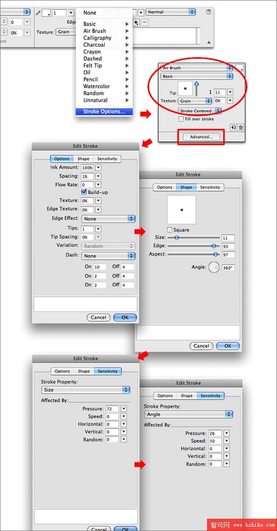 4、隨後在描邊色邊上的下拉框中選擇“筆觸選項”,設置參考如下英文設置,這裡這麼做的目的是將之前鋼筆輪廓進行描邊