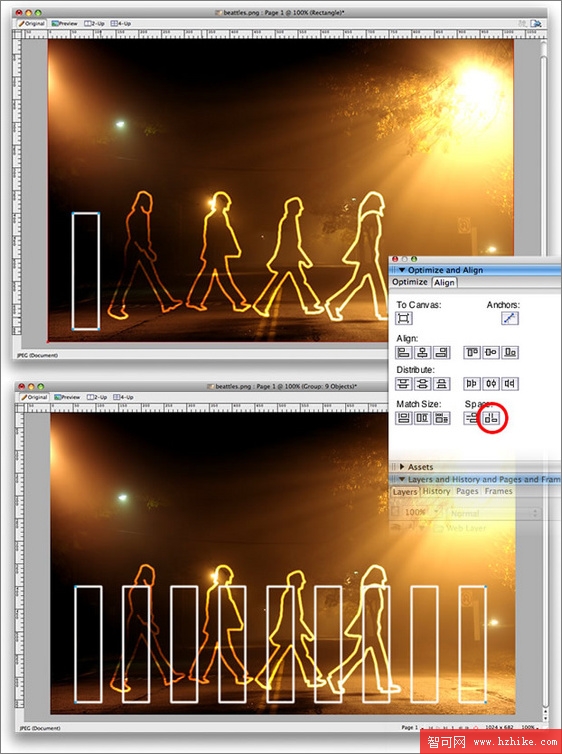 7、復制多次長方形斑馬線,隨後全選,進行變形,然後用之前做人物剪影同樣的方法來制作和背景融合的交通斑馬線效果