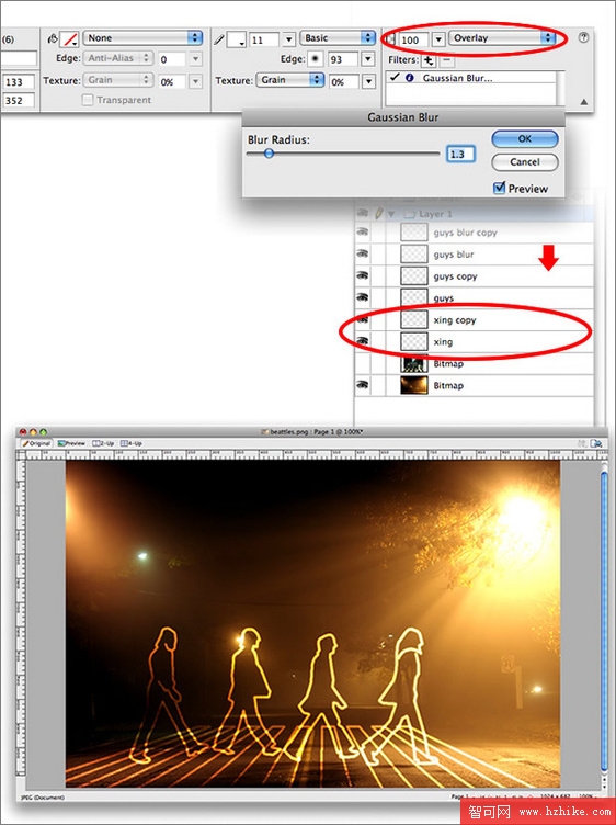 5、復制我們之前做好的人物剪影輪廓描邊3次,隨後為最上面的輪廓圖層(guys blur copy)使用高斯模糊,設置模糊范圍為2,然後將四個圖層同時選中,使用混合模式中的“正片疊底”,這樣之前的白色輪廓就會以金色背景為底色,制作出很特殊的漸變效果