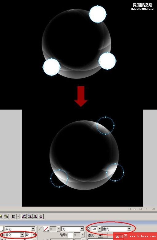 現在畫三個白色的小圓,放在幾個發光點的位置增加光亮。更改羽化為“20%”,圖像混合模式為“柔光”。如果你想使他更加明亮,可以多復制這三個圓。