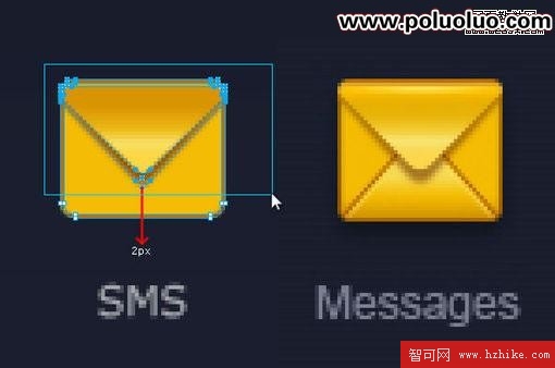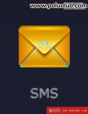 用白色箭頭選中途中所示那些節點,然後用鍵盤的方向鍵往下挪兩個像素,這樣使信封看起來長一點(因為這裡單個圖標不受整體風格約束)。