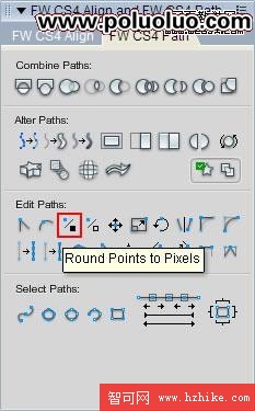我們不能用Stroke去給矩形加外邊框,因為虛邊會把你給搞死。如果你用Rounded Rectangle工具畫出來的圓角矩形已經出現了非Stroke虛邊,那就把節點打散後,用黑色箭頭工具選中那個Path,點擊路徑面板的Round Points to Pixels把路徑的所有節點歸位到像素交點(也可以用白色箭頭工具選中某個節點單獨進行歸位)。
