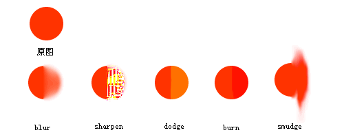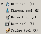 從圖上我們可以了解到blur tool(模糊工具)是用來模糊像素的,可以局部的模糊一塊區域而不用濾鏡的介入;sharpen tool(銳化工具)恰好與模糊工具相反,是用來強調某一塊區域,並使像素突出尖銳起來;dodge tool(dodge字面上是躲避的意思,我更願意翻譯成海綿工具,以下同)是用來加強像素顏色的亮度的,就象一塊海綿在水彩中吸掉一些水分,使顏色變淺;burn tool(burn字面上是燒傷的意思,這裡我翻成抹布工具)是用來加深顏色,減低像素顏色亮度的工具;smudge tool(smudge字面上是弄髒的意思,我翻譯成手指工具)就象是手指上沾上一些顏料後在畫布中揉搓圖象,使兩種顏色互相融合的一種工具。