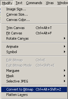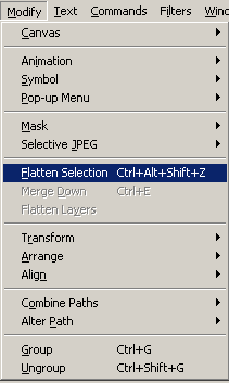 下面就要將該矢量圖轉變成位圖了。還記得fw4中我們是怎麼將矢量圖轉換成位圖的嗎?對,菜單欄中modify裡的convert to bitmap。可我點中fwmx的modify後卻發現,該命令已經換成 flatten seletion了,從快捷鍵上看,兩者作用是一樣的。於是我試了一下,果然,效果是一樣的,只是命令的名稱變了。